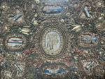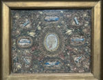 [Paperolle-reliquaire]. CHRIST EN CROIX. Paperolle multicolore début XVIIIème siècle. Au centre un médaillon en carton blanc, peint, offrant un Christ en croix avec les instruments de la Passion. Très riche ornementation (cœurs, médaillons),...