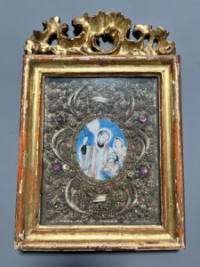 [Paperolle-reliquaire]. LE BAPTÊME. XVIIIe siècle. Médaillon central peint sur velin figurant un baptême. Reliques de St Lambert et St Cosme.18 x 14 cm., sous verre et dans un cadre en bois doré et sculpté de l'époque, papier renouvelé au dos...