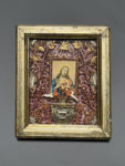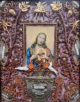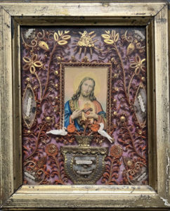 [Paperolle-reliquaire]. SACRÉ-COEUR DE JÉSUS. Début XIXe s. Image coloriée dans une ornementation de papiers rouges au-dessus d'un autel en fils dorés. Deux colombes sculptées en os. Reliques de St Vincent, St. Pierre, Ste Ahphrodise…17 x...