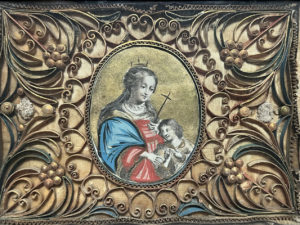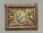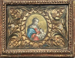 [Paperolle]. VIERGE À L'ENFANT. XVIIIème siècle. Vierge à l'Enfant en médaillon peint, encadrement de papiers de couleurs. 9 x 12 cm. à vue sous verre et dans un cadre en bois peint époque (12 x 16 cm.).