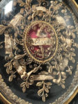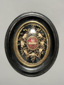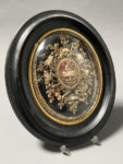 [Reliquaire]. SAINTE CLAIRE. XIXe siècle. Huit petites reliques autour de celle de Ste Claire. Papiers roulés dorés. 16 x 12 cm. à vue sous verre bombé et cadre en bois noir ovale, 24 x 20 cm. (dos remplacé).