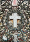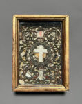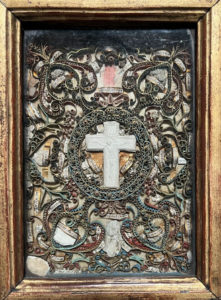 [Paperolle-reliquaire]. CRUCIFIXION en biscuit encadrée de nombreuses reliques. XIXe siècle. Fine ornementation de papiers roulés, dorés, bleus ou rouge.17 x 11 cm. à vue, sous verre et dans un cadre en bois doré (20 x 14 x 4,5 cm ; qq....