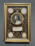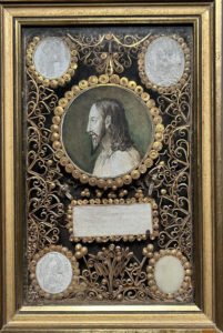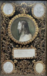 [Paperolle]. XVIIIème siècle. Profil du Christ (?) en médaillon central peint une inscription en dessous insolée, quatre médaillons d'angles dont 3 en biscuit avec portraits (Ste Marguerite, St Chrysostome…) ; papiers roulés roses et dorés....