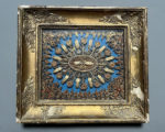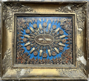 [Paperolle-reliquaire]. XIXe siècle. 12 reliques dans une ornementation de fleurs et papiers roulés dorés. 15 x 17,5 cm à vue sous verre et cadre en bois doré époque (accidents) 23 x 26 x 4 cm.