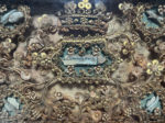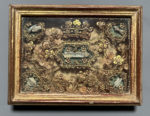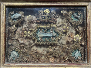 [Paperolle-reliquaire]. SAINT CLÉMENT ; SAINT TIBURCE. XVIIIème siècle. Au centre, relique de St-Clément encadrée par 4 reliques de St Tiburce, riche ornementation de fleurs, fruits, une couronne surmonte le tout. 13 x 18 cm. à vue, sous verre...