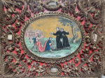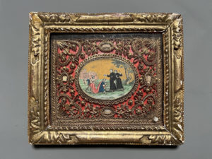 [Paperolle-reliquaire]. SAINT FRANÇOIS-XAVIER donnant le baptême au Roi du Bungi… XVIIème siècle. Au centre, la gravure publiée à Anvers par S. Verbruggen et A. Goetiers dans une série consacrée à la vie de St. François-Xavier. Très...