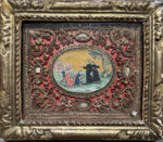 finement aquarellée, elle est placée dans une belle ornementation florale. Avec 4 reliques. 14 x 17 cm. à vue sous verre et cadre en bois doré 19,5 x 23 x 3,5 cm. (cadre et dos recollés).