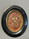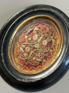 [Paperolle-reliquaire]. Quatre reliques dont Ste Claire. XIXe siècle. 8 x 6 cm. à vue sous verre et cadre ovale bois noir (12 x 10 cm.).