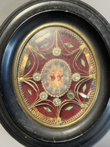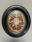 [Reliquaire]. SACRÉ COEUR peint au centre médaillon. XIXe siècle. 6 reliques dont Sainte Chantal. Dans un cadre ovale 15 x 13 cm. (des reliques déplacées).
