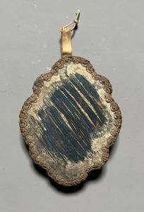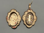 [Paperolle-reliquaire]. VIERGE A L'ENFANT en biscuit dans une boîte double brodée. XVIIIème siècle. 7 reliques avec de petites paperolles. (10 x 8 x 3 cm.).