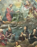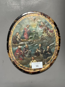 [Image peinte]. Image ovale peinte, la Vierge en prière sous le regard d'un ange, St-Joseph et l'Enfant, St Jean et St Pierre… Dans un cadre 21 x 18 cm.