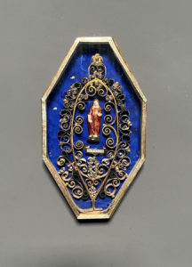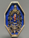 [Paperolle]. Sainte Madeleine. XIXe siècle. Paperolle autour d'un personnage en biscuit peint, avec relique. Boîte sous verre octogonal 17 x 10 cm. (verre fendu ; bordures ext. renouvelées).