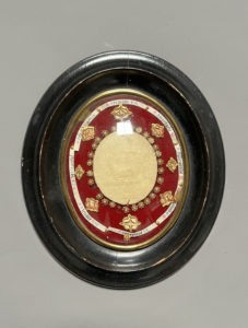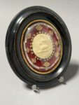 [Reliquaire]. Agnus Dei. Médaillon en relief (hostie ?) avec repésentation de l'Agnus Dei, entouré de perles dans des étoiles dorées (3 déplacées), et en bordure 8 reliques (S. Jeanne de Chantal, S. Félicité, S. Germain, S. Anastasie, S....