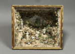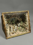 détaché) 8 animaux (moutons, chien, chèvres, canard sur sa mare). Dans une boîte vitrée (27 x 31 x 20 cm.), cadre en bois doré. Superbe travail du XVIIIème siècle. (Qq. défauts).