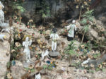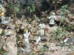CRÈCHE EN VERRE FILÉ DE NEVERS. XVIIIe siècle. Paysage de rocailles avec quatre arbres et de nombreuses fleurs de couleurs vives. 5 personnages en verre (berger portant un mouton, berger jouant de la flute, Roi mage, Prêtre, un petit personnage...