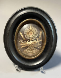 [Canivet en relief-reliquaire]. INSTRUMENTS DE LA PASSION. XIXe siècle. Voile de la Vierge et relique de St François de Sales. 9,5 x 7 cm. à vue sous verre bombé et cadre bois noir (15 x 13 cm., pièce désolidarisée du cadre).