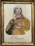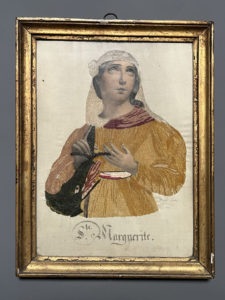[Broderie]. SAINTE MARGUERITE. La tête et les mains du personnage en lithographie, la robe et la coiffure brodées. Titre manuscrit en bas. Mention manuscrite « Maria Gaudel à sa mère 1837 ». 30,5 x 22 cm. à vue, sous verre et cadre époque.