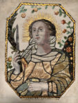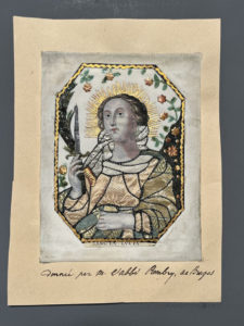 [Broderie]. SAINTE LUCIE. Image gravée brodée sur velin. Flandres, XVIIIe s.13,5x9,8 cm.