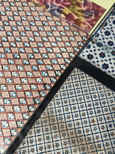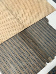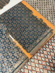 cœur orangé sur fond bleu. Numéroté 233 AB en bas à gauche. 45 x 35 cm. - 2. Fond sable à semé de petits points bruns. 25 x 40 cm. - 3. Alternance de fleurettes bleues à cœur rouge et de groupes de 4 petits carrés bleus. A Orléans chez Perdoux N° 330. 21 x 27 cm. - 4. Impression en bleu, guirlandes florales séparées par des lignes composées de points blancs. A Orléans. 20 x 27 cm. - 5. Impression en bleu, semé de fleurs blanches à cœur orangé. A Orléans chez Letourmi N° 264. 20,5 x 27 cm. 6. - Impression en bleu, lignes composées de cercle avec un point en leur centre. A Orléans chez Perdoux N°412. 21,5 x 29 cm. - 7. Impression en bleu et bistre, semé de losanges contenant des fleurs en forme de tulipes. 21 x 27 cm. - 8. Composition abstraite en rouge, bleu et jaune. 19,5 x 25,5 cm. - 9. Alternance de petites grenades en rouge ou bleu et de croix noires. 21 x 16 cm. - 10 à 13. Quatre petites couvertures à motifs floraux semés dont deux semblables. Env. 16 x 19 chaque. - 14. Lignes perpendiculaires et cercles inscrits, en rouge et noir. 14 x 21 cm. 15. Deux fragments d'env. 5 x 17 cm. qui semble imprimés au pochoir.