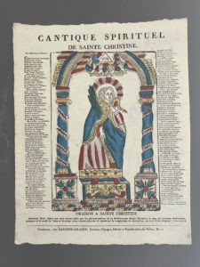 [Imagerie populaire]. CANTIQUE SPIRITUEL DE SAINTE CHRISTINE. A Chartres, chez Garnier-Allabre. Gravure sur bois coloriée. 38x29,5 cm.