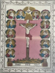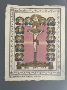 [Imagerie populaire]. PRIEZ POUR NOUS. A Chartres, chez Garnier-Allabre. Gravure sur bois coloriée. 7x29,5 cm.