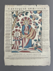 [Imagerie populaire]. CANTIQUES SPIRITUELS. ORAISON À SAINT JOSEPH. A Chartres, chez Garnier-Allabre. Gravure sur bois coloriée. 39x30 cm.