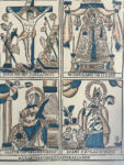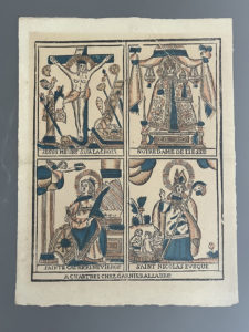 [Imagerie populaire]. JÉSUS MEURT SUR LA CROIX. NOTRE DAME DE LIESSE. SAINTE CATHERINE VIERGE. SAINT NICOLAS ÉVÊQUE. A Chartres, chez Garnier-Allabre. Gravure sur bois coloriée. 39x30 cm.