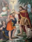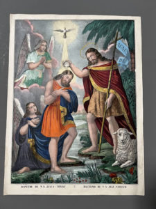 [Imagerie populaire]. BAPTÊME DE N. S. JÉSUS-CHRIST = Bautismo de N. S. Jesu-Christo. A Paris chez Gosselin ; chez Forgues à Montrejeau. Lithographie en couleurs, peinte et gommée. 66 x 49,5 cm. Salissures en marge.