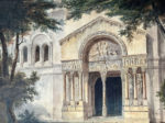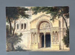 [Dessin]. [Architecture]. Vue du portail roman de la basilique primatiale Saint-Trophime d'Arles. Aquarelle sur papier vergé, XIXe siècle (filigrane daté de 1829). 40 x 67 cm. Petites déchirures sur la partie droite.