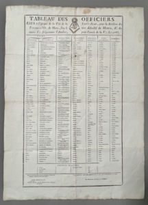 [Franc-maçonnerie]. [Sarthe]. Tableau des officiers élus à l'époque de la fête de la Saint-Jean, pour la direction des travaux de l'O... du Mans, sous le titre distinctif de Moria... pour l'année de la V... L... 5788. [Le Mans (?), 1788]....