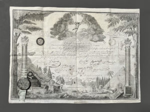 [Franc-maçonnerie]. Brevet d'apprenti délivré le 23 octobre 1818 pour Modeste Bellière de Houdan (Seine-et-Oise). Complet du sceau. 41x50 cm. Imprimé sur Parchemin.