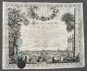 [Franc-maçonnerie]. Brevet de Maître de Modeste Bellière, 1er octobre 1832. Loge Philadelphique de Paris. Complet du sceau. 40x50 cm. Sur parchemin.