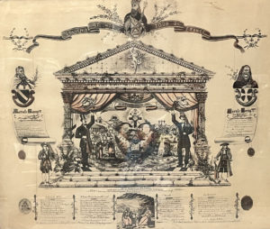 [Gravure]. [Compagnonnage]. Souvenir de mon tour de France. Composé par A. Robert, Saintonge l'Ami des arts, compagnon vitrier reçu à Marseille, 1865. Lithographie rehaussée, 48 x 57 cm. à vue, sous verre et cadre moderne (frott. sur le nom...