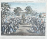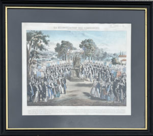 [Gravure]. [Compagnonnage]. La réconciliation des compagnons. Dessiné et lithographié par Dorléans. [Paris], Agricol Perdiguier, XIXe s. Lithographie en couleurs rehaussée, 42 x 49 cm. à vue, sous verre et cadre moderne (restauration en marge).
