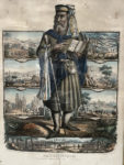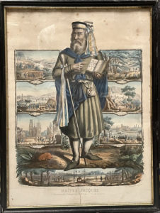 [Gravure]. [Compagnonnage]. Maître Jacques, fondateur des Compagnons du Devoir (ami de Soubise). [Paris], Agricol Perdiguier [Lith Becquet], XIXe siècle. Lithographie en couleurs rehaussée, 59 x 43 cm. à vue, sous verre et cadre ancien...