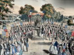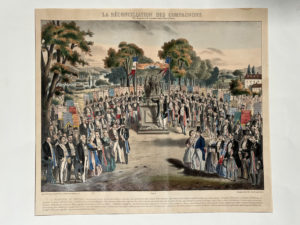 [Gravure]. [Compagnonnage]. La réconciliation des compagnons. Dessiné et lithographié par Dorléans. [Paris], Agricol Perdiguier, Impr. Bacquet, XIXe s. Lithographie en couleurs rehaussée et gommée, 44 x 53 cm. marges incluses (mouill. claires...