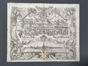 [Gravure]. [Alsatica]. [Certificat de maîtrise d'un compagnon. 1786]. Gravure sur cuivre, imprimée chez J. H. De Ker à Colmar en 1779. 40,5 x 49 cm. (cuivre). (Qq. froissements). Traduction en français du texte : « Nous, maîtres honorables du...