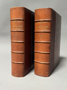 ALLEMAGNE (Henry-René d'). Les cartes à jouer du XIVe au XXe siècle. Paris, Hachette 1906. 2 forts volumes grand in-4 demi-chagrin havane, têtes dorées, couvertures conservées. XVI-504 + 640 pages. 3200 reproductions de cartes dont 956 en...