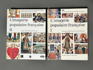 IMAGERIE POPULAIRE FRANCAISE (L'). Paris, 1990, 2 volumes in-4 brochés. I- Gravures en taille-douce et en taille d'épargne. 492 pp. 24 planches en couleurs et très nombreuses ill. en noir. II-Images d'Epinal gravées sur bois. 468 pages, 16...