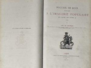 LIESVILLE (A.-R. de). Recueil de bois ayant trait à l'imagerie populaire, aux cartes, aux papiers, &. Caen, F. Le Blanc - Hardel, 1867. Grand in-folio (53,5 x 36 cm.), [5] f., 130 planches, demi-chagrin brun époque, dos à 5 nerfs, auteur, titre et...