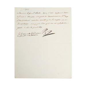 [NAPOLÉON Ier]. Lettre au Ministre de la Guerre Henri-Jacques-Guillaume Clarke, dictée à son secrétaire Méneval, signée : « Monsieur le general Clarke, donnez l'ordre au general Suchet // de se rendre à Sarragosse et de prendre le commandement du 3e corps. // Le Duc d'Abrantes reviendra aussitôt qu'il sera remplacé par le // General Suchet. Sur ce je prie Dieu qu'il vous ait en sa sainte garde. à Paris le 5 avril 1809. // Le 6 remis a M. Girard pour // en faire part a M. […]. »