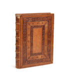 • Registrvm Alphabeticvm svper octo libros Ptolomei incipit feliciter. •• De locis ac mirabilibvs mvndi. et primo de tribvs orbis partibvs. Impressvm Vlme opera et // expensis Ivsti de Albano // de Venetiis per provisorem // svvm Iohannem Reger. An//no. Domini. m.cccc.lxxxvi. // xii. Kalendas. Avgvsti., [Ulm, Johannes Reger & Justus de Albano, 21 juillet 1486]. In-folio (287 x 395 mm), veau, large décor d'encadrement estampé à froid ornant les plats, dos à nerfs orné (E. Capelle Rel).