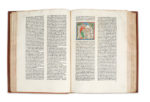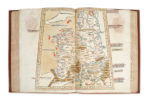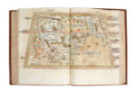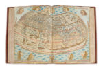32 CARTES EN COULEURS GRAVÉES SUR BOIS et sur double-page, par Johannes von ARMSHEIM d'après Nicolaus GERMANUS (dont une mappemonde, quatorze de l'Europe, quatre de l'Afrique & treize de l'Asie) ; nombreuses lettrines aquarellées dont deux historiées, l'une représentant Nicolaus Germanus offrant son livre au pape Paul II (a1), l'autre Ptolémée tenant une sphère et un compas (a2 v°) ; quatre bois de figures géométriques dans le texte (a10 v°, b1 v° & b2), & marque d'imprimeur au colophon.