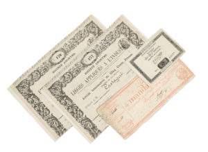 Assignat de dix livres (1792), Promesse de mandat territorial, bon pour cent francs (An IV), & deux actions nominatives de 500 francs (Société anonyme des lièges appliqués a l'industrie) délivrée à M. Castagné (1874).