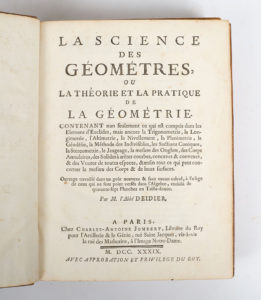 La Science des Géométres, ou La Théorie et la Pratique de la Géométrie. A Paris, Chez Charles-Antoine Jombert, Libraire, 1739. 4 parties en 2 volumes in-4°, veau blond, roulette dentelée dorée encadrant les plats, petit fleuron aux angles, dos à nerfs orné (reliure de l'époque).
