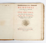 Memoires pour servir a l'Histoire de la Fête des Foux, qui se faisoit autrefois dans plusieurs Eglises. A Lausanne & à Geneve, Chez Marc-Michel Bousquet & Compagnie, 1741. In-4° non rogné, cartonnage en demi-toile brune postérieure.