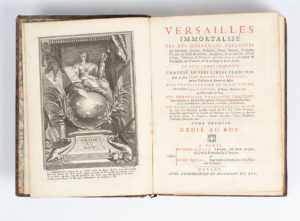 Versailles immortalisé par les merveilles parlantes des Bâtimens, Jardins, Bosquets, Parcs, Statues, Groupes, Termes, & Vases de marbre, de pierre, & de métaux, Pieces d'eaux, Tableaux & Peintures qui sont dans les Châteaux de Versailles, de Trianon, de la Ménagerie & de Marly […]. A Paris, Chez Etienne Ganeau, Libraire, & Jacque Quillau, Imprimeur-Libraire, 1720. In-4°, veau granité, dos à nerfs orné (reliure de l'époque).