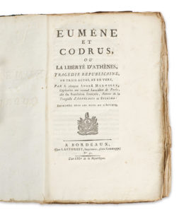 Eumène et Codrus, ou La Liberté d'Athènes, Tragédie républicaine, en trois actes, et en vers. A Bordeaux, Chez Lafforest, Imprimeur, L'an IIIe de la République [1794-1795]. In-8° broché, non rogné, couverture d'attente