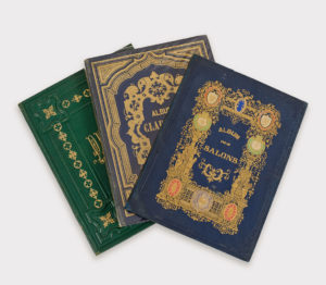 • BLAZE, LABEDOLIÈRE, BURGER, MATTHIAS, EMMICH, etc. Album des Salons. Paris, Victor Lecou, Éditeur, s. d. In-4°, percaline bleue, large décor polychrome romantique ornant les plats, tranches dorées (cartonnage de l'éditeur). « Gravures allemandes et anglaises ». Quelques mouillures et rousseurs.