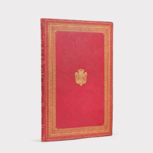 Noticia histórica de la cuchillería y de los cuchilleros antiguos en España. Madrid, Imprenta y estereotipia de M. Rivadeneyra, 1871. Petit in-folio, chagrin rouge, large roulette dentelée dorée encadrant les plats, armoiries au centre, dos à nerfs orné (reliure de l'époque).